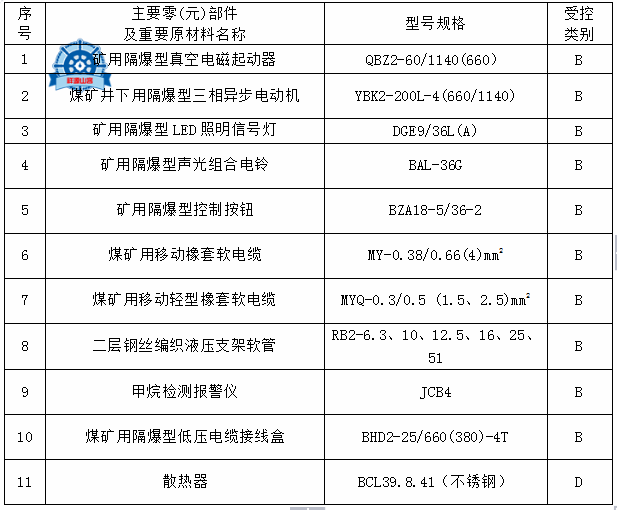 電動防爆挖掘機主要零(元)部件及重要原材料明細配置表